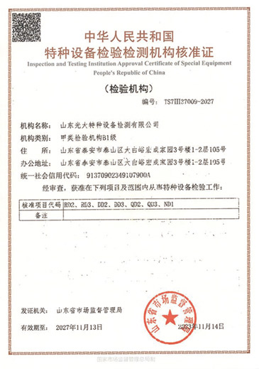 【特種設(shè)備檢驗(yàn)資質(zhì)和檢驗(yàn)范圍】 RD2 定期檢驗(yàn):第一、二、三類(lèi)固定式壓力容器(不含超高壓容器,大型高壓者器、球形儲(chǔ)罐) RD3定期檢驗(yàn):第一、二類(lèi)固定式壓力齊器(不含球形儲(chǔ)罐) DD2定期檢驗(yàn):公用管道 DD3定用檢:工業(yè)管道 QD2 定期檢驗(yàn):塔式起重機(jī)、流動(dòng)式起重機(jī),門(mén)座式起重機(jī),升降機(jī),纜索式起重機(jī)、梔桿式起重機(jī),額定起重量小于 10T(不含10T)的橋式起看機(jī)和門(mén)式起重機(jī) QD3定期檢驗(yàn):流動(dòng)式起重機(jī),塔式起重機(jī),升降機(jī) ND1定期檢驗(yàn):場(chǎng)(廠(chǎng))內(nèi)專(zhuān)用機(jī)動(dòng)車(chē)...